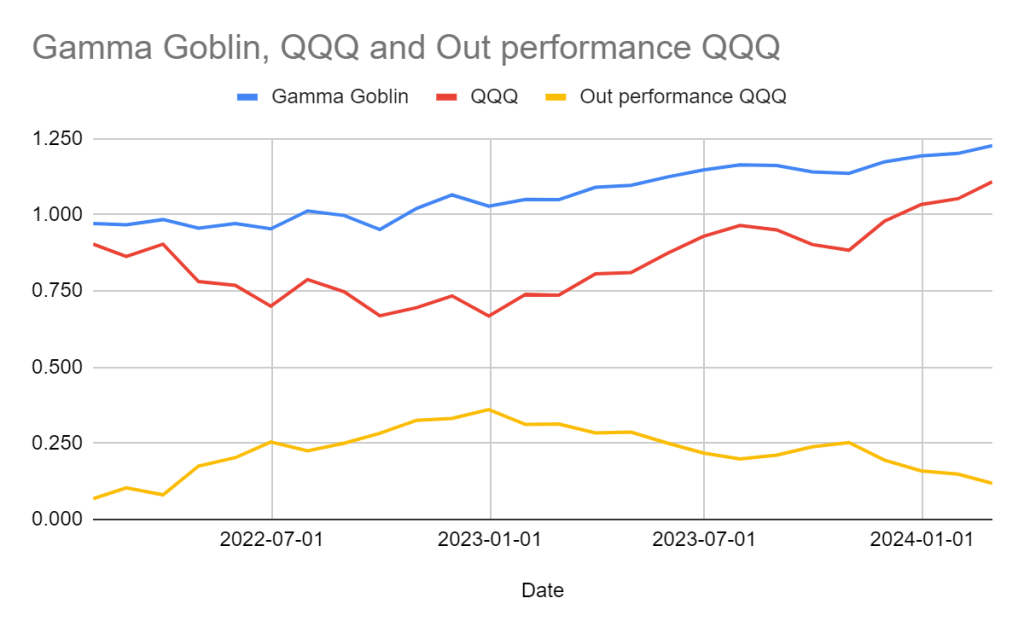 The Gamma Goblin strategy’s performance can be visualised in the second chart, depicting a more modest yet stable rise of 2.5 percent in February 2024, against its benchmark, QQQ, which is up by 5.6 percent. Since its inception in January 2022, The Gamma Goblin has shown a remarkable increase of 22.7 percent, outstripping the QQQ’s rise of 10.9 percent. This indicates that while the Nasdaq, as represented by QQQ, continues to rally, The Gamma Goblin’s overperformance has narrowed. Nevertheless, the strategy has successfully avoided the significant downturns that have affected the tech sector, adhering to its guiding principle of capital protection.