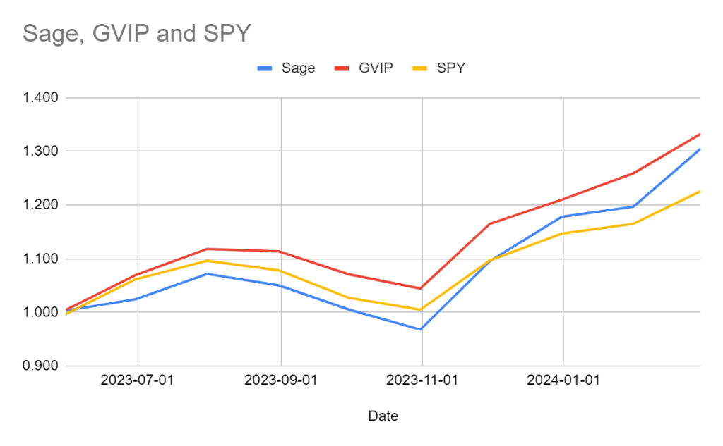 The recent performance of The Sage strategy has been commendable, as illustrated by the first chart. It shows a noteworthy increase of 10.8 percent, which is a significant achievement considering the performance of its benchmarks—GVIP is up by 7.3 percent and SPY by 6.1 percent. This chart demonstrates The Sage’s consistent outperformance, particularly as it approaches GVIP’s cumulative return since May 2023, with only a 3 percent lag. Against SPY, The Sage’s outperformance is even more pronounced at 7.9 percent, showcasing its robust strategy in a strong market.