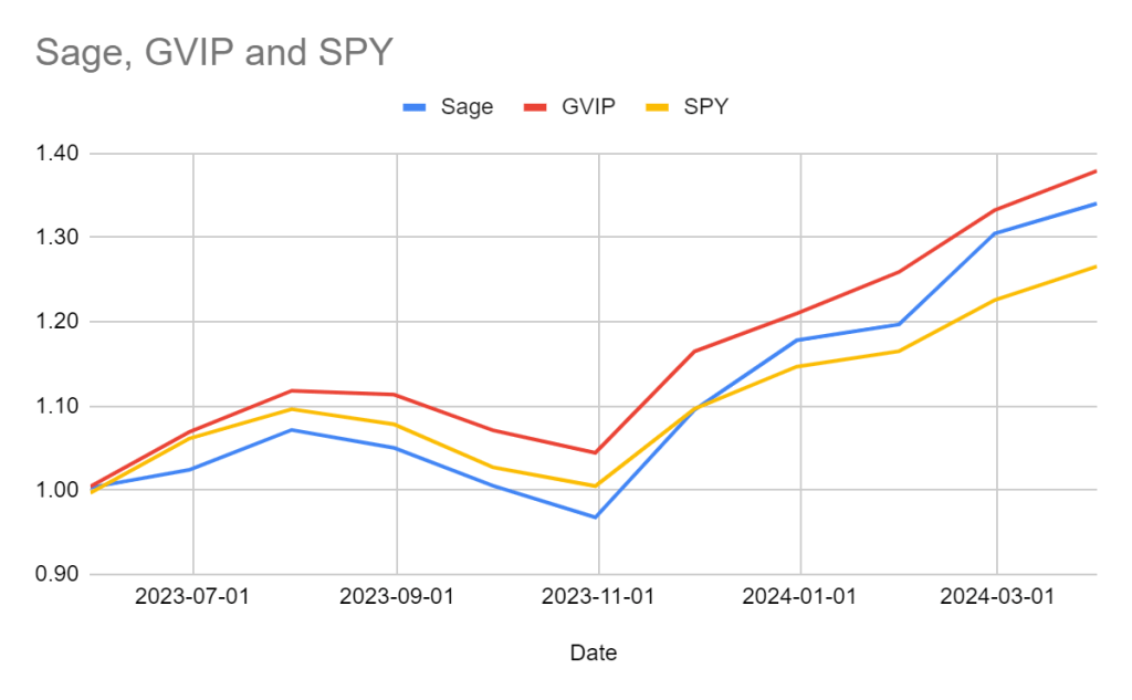 Turning our attention to The Sage, it currently trails one of its benchmarks by roughly 4%. Despite this, The Sage is engaging in a robust performance, and we maintain our conviction that it will ascend to outperform, particularly as it transitions to cash holdings during drawdown periods, as is its strategic design.