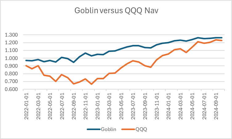 In October, Gamma Goblin delivered nearly flat returns, finishing up by a fraction of a percentage point while QQQ closed down approximately 1%. Since its inception in January 2022, Gamma Goblin has outperformed QQQ by 3.59%, consistently delivering value even through challenging market conditions. With a monthly information ratio of 1.04 compared to QQQ’s 0.38, we’re confident in the strategy’s resilience and believe it’s primed for expanded investment and development.