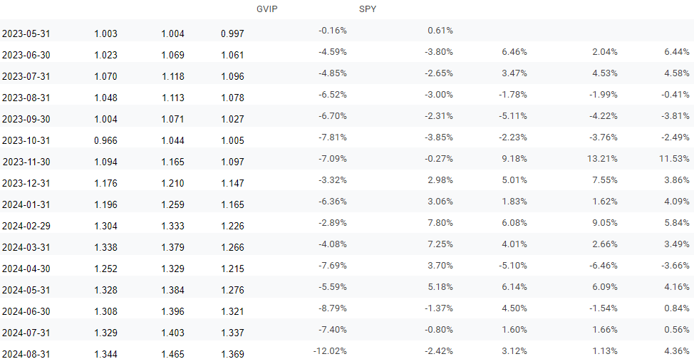 Originally, our benchmark was intended to be the S&P 500, and we will still include it for reference. However, we have discovered another benchmark, GVIP, managed by Goldman Sachs. A notable difference between GVIP and our strategy is their portfolio composition. GVIP maintains 50 positions, whereas we have 20. They use equal weighting, while we focus on risk management. Additionally, we have the flexibility to move into cash positions, whereas GVIP is always fully invested.